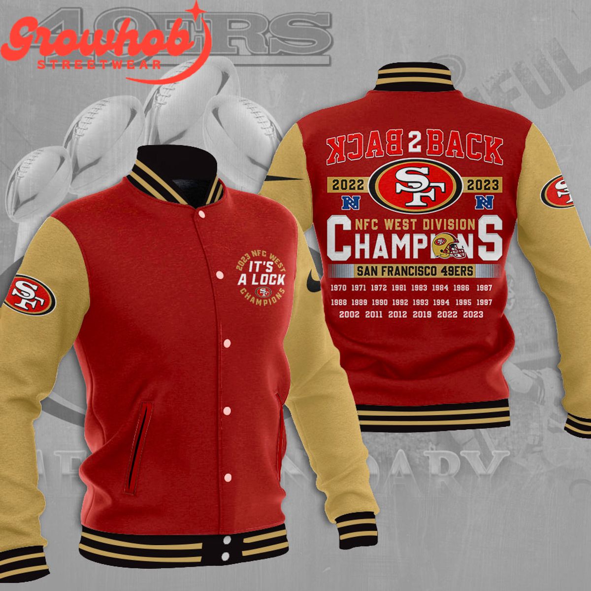 The San Francisco 49ers NFC West Champs Back2back Baseball Jacket is a symbol of consecutive triumphs. Crafted with premium materials, this jacket features bold graphics celebrating the team’s back-to-back NFC West Championship titles. The design seamlessly blends contemporary style with classic baseball aesthetics, making it a must-have for devoted fans. Whether worn on game days or casually, this officially licensed jacket reflects the pride and success of the 49ers in securing consecutive NFC West Championships. Elevate your fan gear with this statement piece, proudly showcasing the team’s excellence and your unwavering allegiance to the San Francisco 49ers.